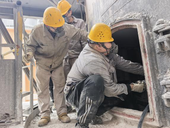 进入实质性排除阶段,挑战接踵而至。出灰口空间极其狭窄,而托灰盘单体厚重,单块重达80多公斤,且作业环境充斥粉尘。维修团队创新采用“多点受力、同步平移”拆卸法,利用自制吊点与手动葫芦配合,经过反复调试与精准操作,成功将受损部件安全取出。随后,团队顶着粉尘弥漫、空间受限的恶劣环境,以剩余完好部件为基准,有序完成了变形部件的割除与清理工作,彻底消除了潜在的安全隐患。